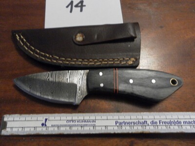 Ich verkaufe aus meiner Sammlung ein kleines schönes und absolut neuwertiges Damast Jagd - oder Campingmesser. Es besteht aus 1095&15N20 er Stahl und ist handgeschmiedet. Es ist Gesamt 16,0 cmm lang und die Klinge beträgt 7 cm. Der Griff besteht aus Holz. Dazu gehört eine Lederscheide.