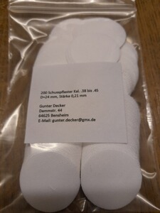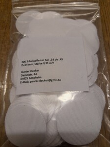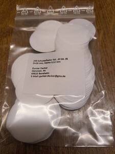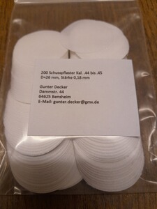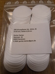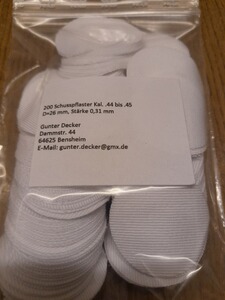 Schusspflaster Vorderlader Kal. .44 bis .45 Ø 26mm Durchmesser, Stärke 0,12mm 0,005inchPrivatanbieterNeu & originalverpacktSofortkauf:EUR 8,6021 Tage 13 Std. - Schusspflaster Vorderlader Kal. .38 bis .45 Ø 24mm Durchmesser, Stärke 0,21mm 0,008inch