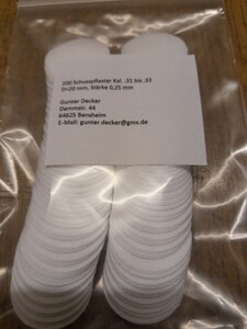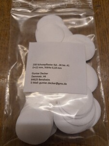 Schusspflaster Kal. .54-.58 Ø 32mm (Durchmesser), Stärke 0,18mm oder 0,007inch PedersoliPrivatanbieterNeu & originalverpacktSofortkauf:EUR 6,003 Tage 13 Std. - Schusspflaster Vorderlader Kal. .36 bis .41 Ø 22mm Durchmesser, Stärke 0,21mm 0,008inch