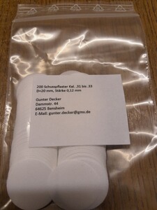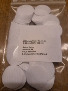 Schusspflaster Vorderlader Kal. .31 bis .33 Ø 20mm Durchmesser, Stärke 0,25mm 0,010inchPrivatanbieterNeu & originalverpacktSofortkauf:EUR 8,4021 Tage 13 Std. - Schusspflaster Vorderlader Kal. .38 bis .45 Ø 24mm Durchmesser, Stärke 0,18mm 0,007inch