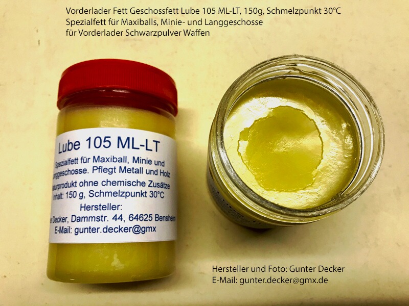 Geschossfett Vorderlader Fett Lube 105 ML-LT 150g für Maxiball Minie LanggeschossePrivatanbieterNeu & originalverpacktSofortkauf:EUR 18,003 Tage 13 Std. - Vorderlader Fett Geschossfett Lube 104 BP 15g Schusspflaster Revolver Maxiballs Minie Langgeschosse