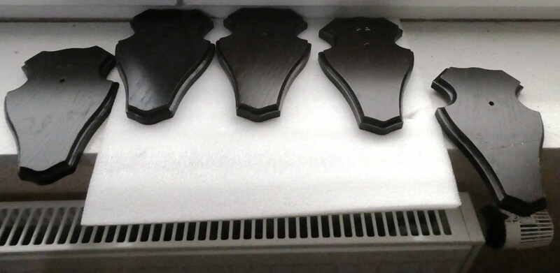 - 5 dunkele gleichfarbige bzw. gleiche Rehbock Gehörnbrettchen mit Gebißklammern