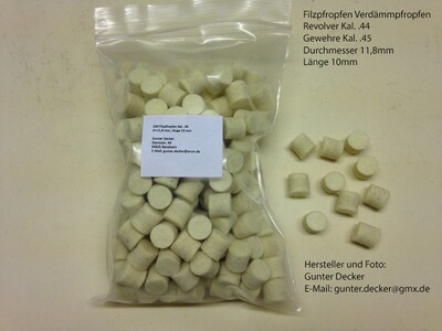 200 Filzpfropfen Verdämmpfropfen Dicke 11,8mm, Länge 10 mm, Revolver Kal. .44, Gewehre Kal. .45PrivatanbieterNeu & originalverpacktSofortkauf:EUR 17,5065 Tage 18 Std. - Rundkugeln Kaliber .450 .451 .452 .454 .457 Vorderlader Perkussionsrevolver Kal. .44